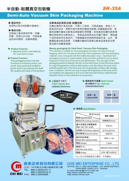 Implanté à Taiwan depuis 1971,CHIE MEI ENTERPRISE CO., LTD.est un fabricant de machines et d'équipements d'emballage commercial. Ses principales machines d'emballage et de scellage flexibles comprennent :Machine d'emballage sous vide semi-automatique, machines de suremballage automatiques, machines d'emballage rétractable commerciales, machines d'emballage sous vide commerciales, équipements d'emballage alimentaire, équipements d'emballage de boîtes, machines d'emballage sous blister, machines de suremballage automatiques de cellophane, certifiées ISO 9001 et CE pour répondre aux normes internationales.